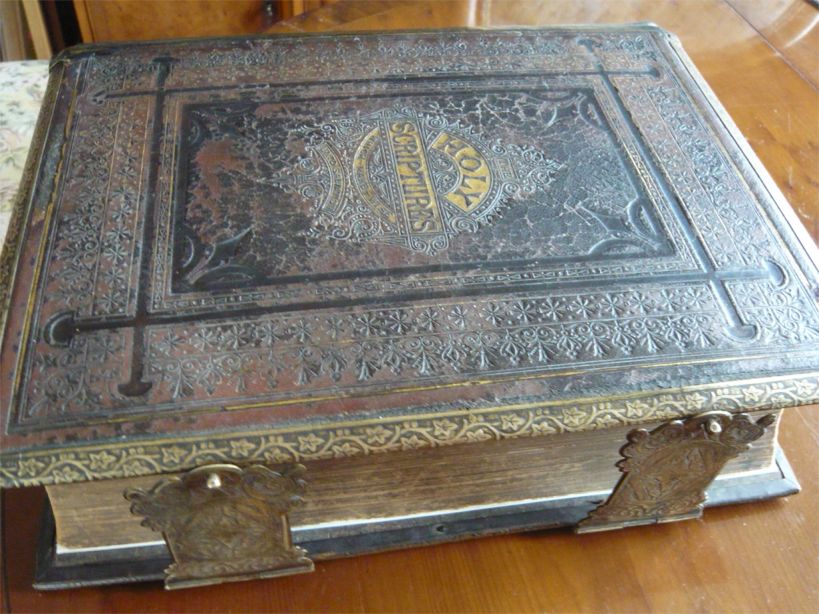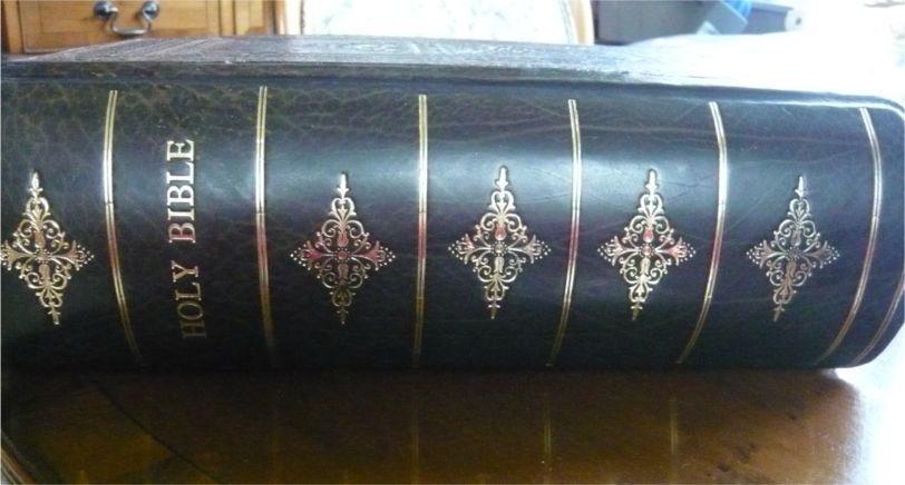 In October I wrote about my family Bible before I took it to a local bookbinder to repair it. The front cover was completely detached as were a number of the first pages including details of births, marriages and deaths in the family from the latter part of the 19th century. The spine had almost crumbled away and the detached pages were flaking away. The metal clasps wouldn’t fasten.