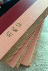 Pride and Prejudice, Emma and Sense and Sensibility by Jane Austen, a three book set published by Nelson Doubleday has deckled edges. A note with the books explained that deckled edges are formed at an early stage as pulp is allowed to flow against rubber deckle straps between the frame and the edges of a paper makers mould.